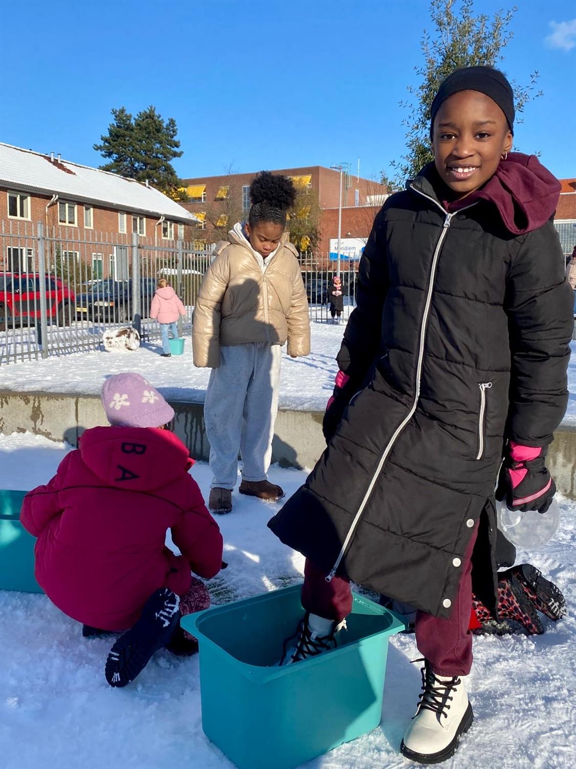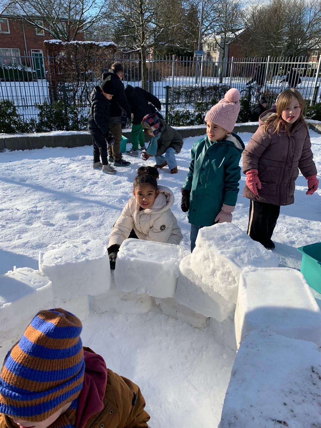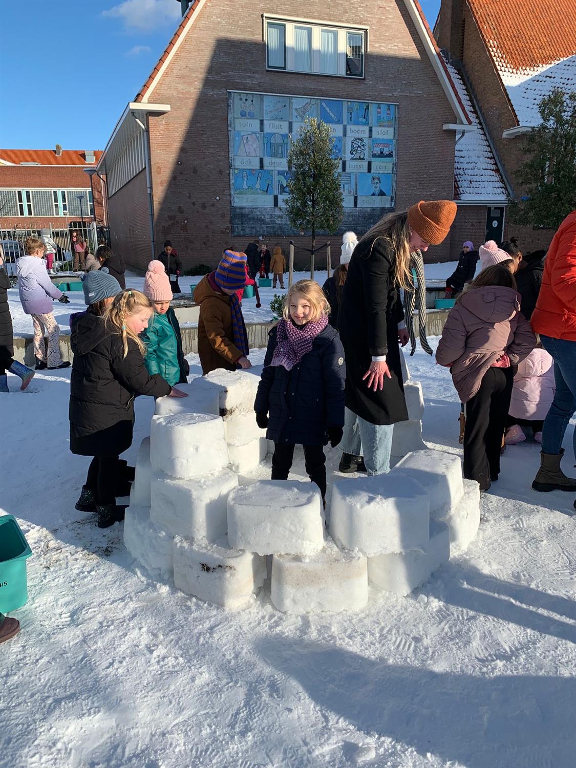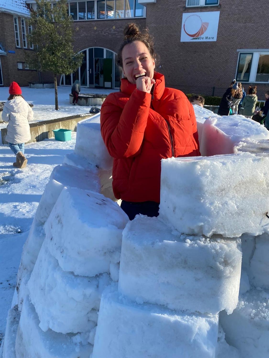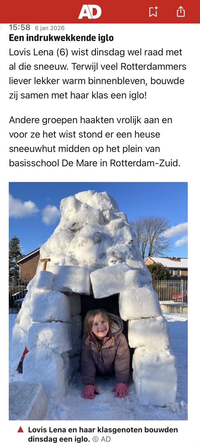 6 januari Vandaag hebben ongeveer 300 kinderen van de Mare gezamenlijk, in ploegendienst, onder leiding van juffrouw Mareille en juffrouw Aagje een gigantische iglo gebouwd. Alle kinderen werkten zo hard, dat ze de kou niet eens meer voelden.