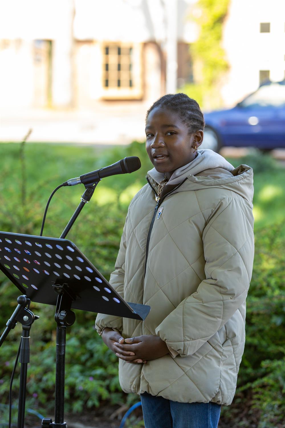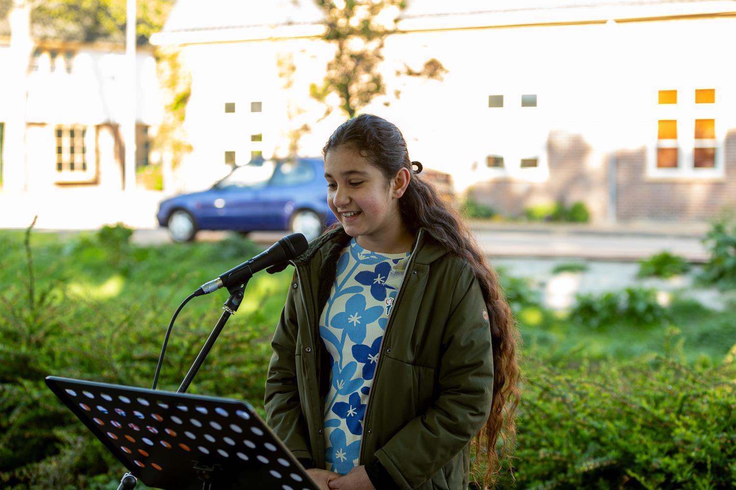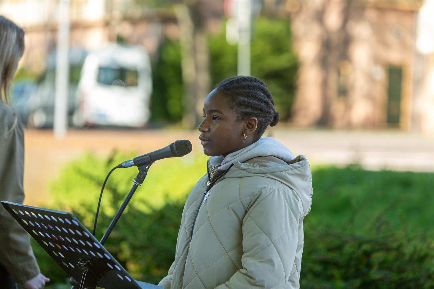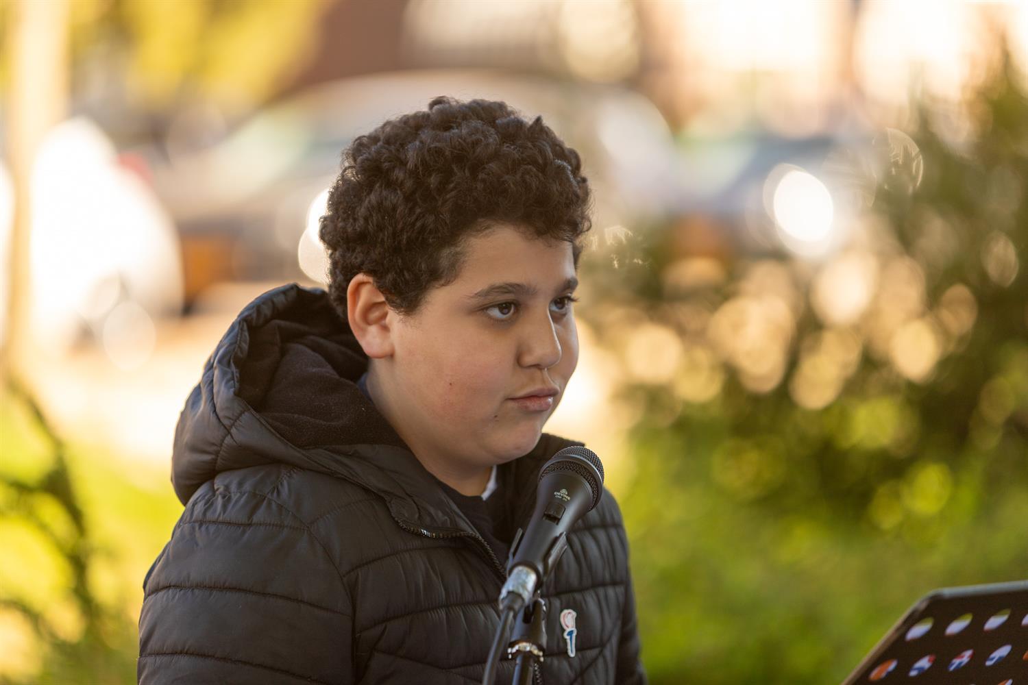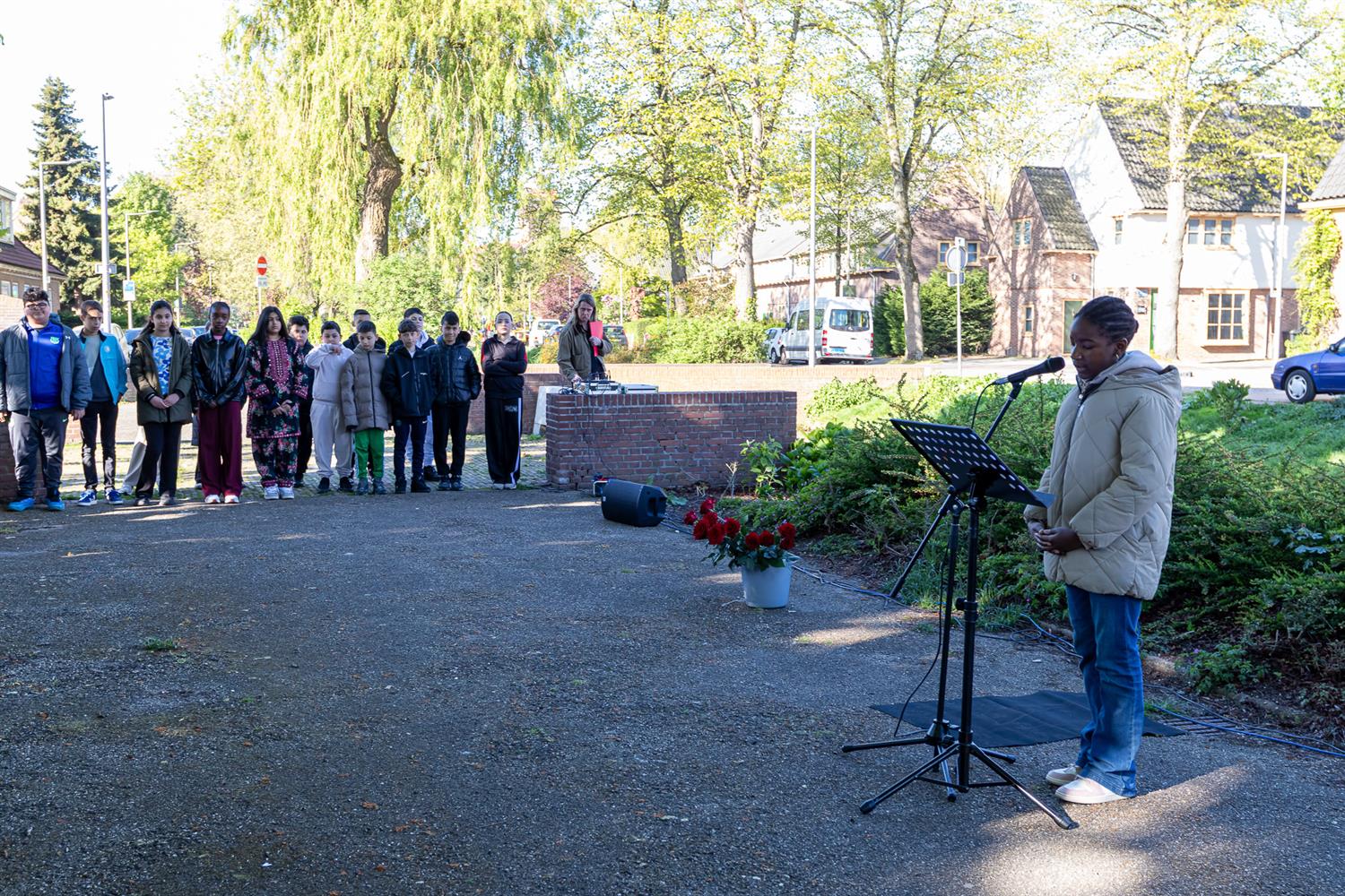 Jaela met het gedicht: "5 jaar oorlog was voorbij"