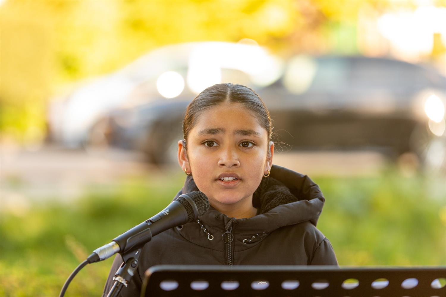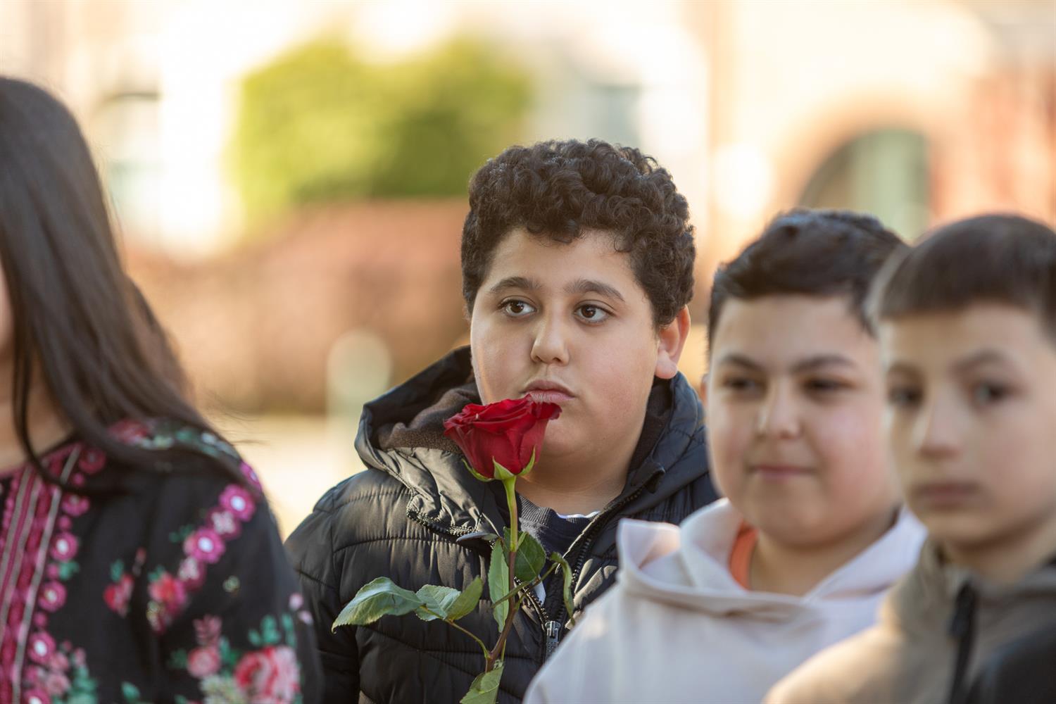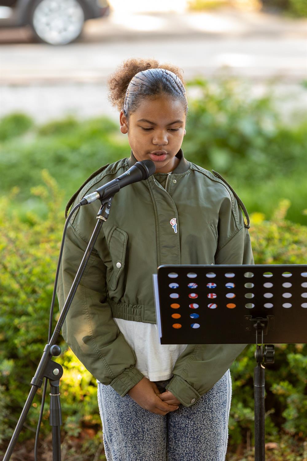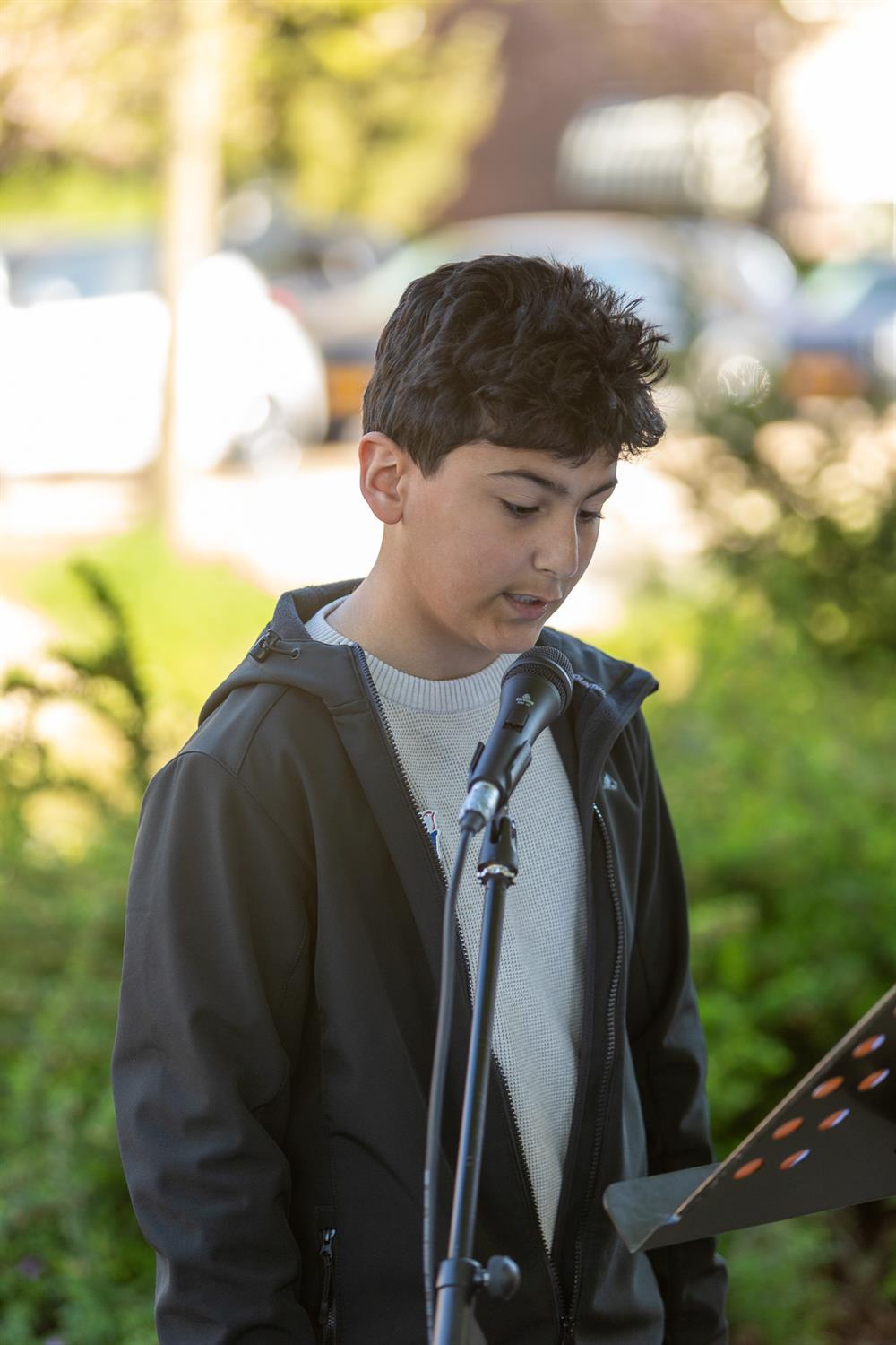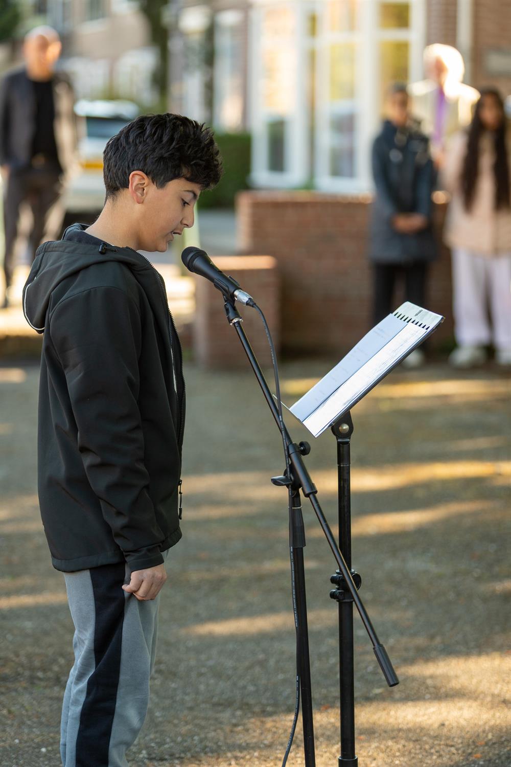Jaela met het gedicht: "5 jaar oorlog was voorbij"