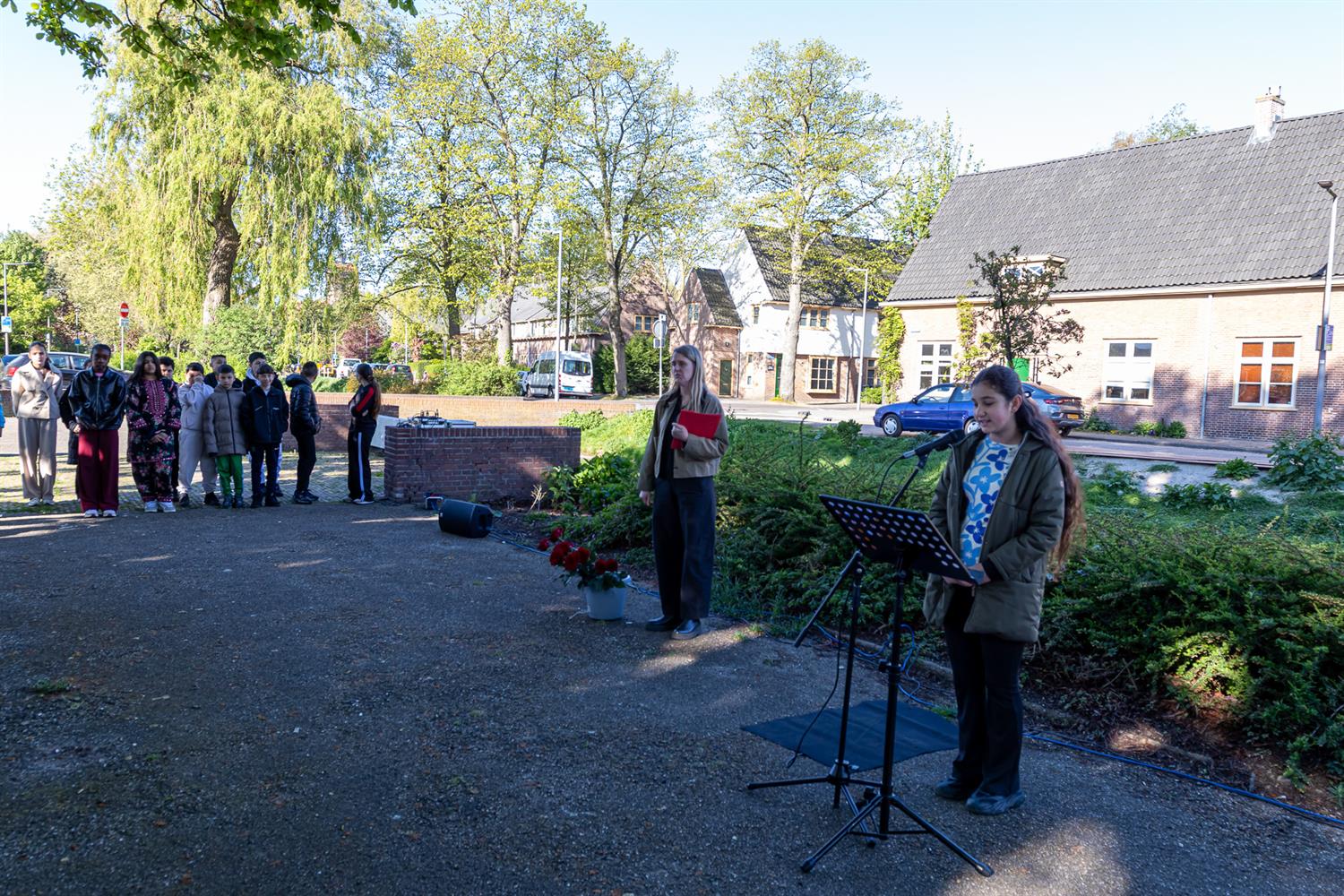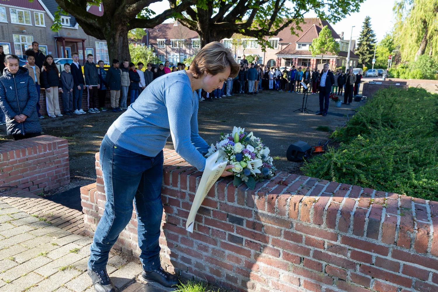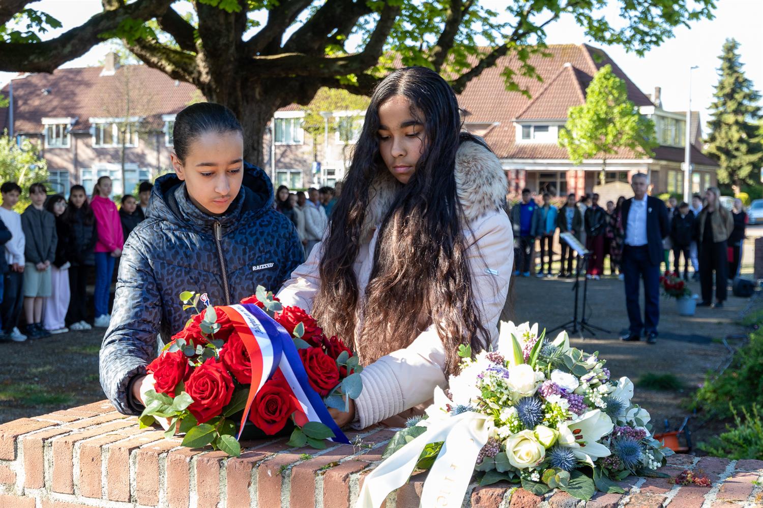 Kranslegging door Oumnia en Romaisha namens de leerlingen en leerkrachten van de Mare.